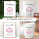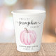 Coupes en papier mignonnes pour votre douche bébé d'automne avec "A Sweet Little Citrouille Is On Her Way" écrit dans une simple typographie grise et un script élégant avec des swashes, et une aquarelle citrouille rose pastel.