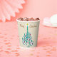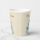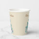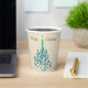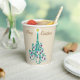 Belle tasse en papier avec une peinture numérique originale de Leslie Sigal Javorek d'un arbre de Noël turquoise tourbillonnant avec des ornements violets sur une Trompe L'oeil (astuce de l'oeil) illusion arrière - plan de porcelaine fine en os et plus de profondeur.