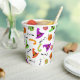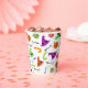 Amusants tasses en papier d'Halloween avec bonbons, casquettes citrouille et sorcières en orange, vert et violet sur un arrière - plan blanc. Ces tasses en papier seraient idéales pour une fête d'anniversaire à thème Halloween ou une fête d'Halloween costumée.