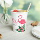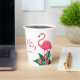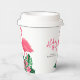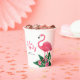 Baby shower invitation design avec flamingo rose avec frondes de feuilles de palmier vert luxuriant et fleurs d'hibiscus tropical. "Aloha Baby". Un motif à fleurs tropicales aux couleurs arrière - plans noires habille le dos de la carte.