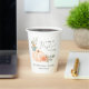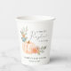 Jolies tasses en papier pour votre baby shower avec "A Sweet Little Citrouille Is On Her Way", écrites en typographie gris moderne et écriture stylée avec un swash de coeur, et un bouquet d'aquarelle d'un citrouille orange, des fleurs et de la verdure. Personnalisez le nom de la mère et la date de la douche dans une simple typographie grise moderne.