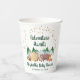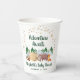 De mignons tasses en papier baby shower rustique avec une aquarelle illustrant les animaux des bois campant avec leur tente dans les montagnes et la forêt, une superposition d'étoiles dorées, et "Adventure Awaits" et le nom de la future mère dans un script vert de forêt.