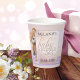 Élégantes tasses en papier avec un lilas avec un design pêche avec dentelle et pois et un ours en peluche mignon. Beau pour un baby shower.