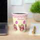 Voici un mignon singe souriant et un thème rose vif pour célébrer l'anniversaire d'un enfant de deux ans. Le singe agite un ballon rose avec la figure 2 dessus. Le texte est entièrement modifiable et est en rose assorti : "Madison is Two. Fêtons !" Les tasses ont un arrière - plan couleur crème et un motif de taches roses autour du sommet.