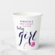 Cette mignonne tasse en papier pour une douche pour petite fille présente une charmante combinaison de rose fuchsia et bleu marine. La typographie "Baby girl" est élégamment présentée en bleu marine, tandis qu'une charmante baleine rose fuchsia arrose joyeusement les coeurs. Pour ajouter une touche personnelle, la tasse inclut également le nom de la future mère, ce qui en fait un complément parfait à toute célébration de baby shower.