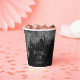 Optez pour un look glamour Old Hollywood en utilisant les pièces de cette suite mariage comme indiqué, avec des bijoux en cascade des feuilles de palmiers incrustés de diamants ou supprimer les couches de bijoux pour un look un peu plus conservateur. Cet ensemble présente des feuilles en argent chatoyant contre un arrière - plan texturé au charbon de bois foncé. La tasse en papier mariage montrée ici a une bordure de feuilles étincelants, un message personnel de "Merci" et les noms de la mariée et du marié et la date du mariage. Entrez facilement vos coordonnées en utilisant le modèle fourni. Affichez le lien de collection sur cette page pour voir tous les éléments correspondants dans ce bel ensemble ou recherchez ID830 pour voir d'autres options de couleur pour cette conception.