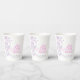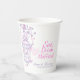Personnalisez ces tasses en papier de fête de mariage avec le nom de votre couple et les dates de mariage. De mignons oiseaux par une cage avec des fleurs de printemps dans de jolis tons roses sur le blanc, d'autres articles assortis sont également disponibles. © Graphique original de deux oiseaux dans une cage à oiseaux ouverte dessin avec coeurs graphiques design par Sarah Trett pour www.mylittledenweddings.com sur Zazzle.