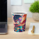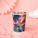 Enfant de super-héros bleu et rouge avec des tasses de papier de fête d'anniversaire de cape.