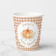 Cette tasse en papier baby shower de sauce comporte un citrouille d'aquarelle, un feuillage d'automne et un arrière - plan motif en plaid de couleur orange.