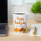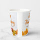Cette élégante tasse en papier moderne d'entreprise Thanksgiving party dispose d'une belle ligne de feuilles d'automne sur un arrière - plan en bois blanc. Personnalisez avec vos informations d'entreprise sur les tasses en orange et marron pour un ajout classe à un dîner de vacances client.