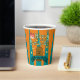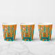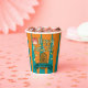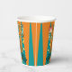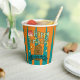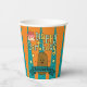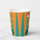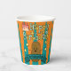 Adorable tasses de papier d'anniversaire pour égayer votre fête. Sur un arrière - plan orange, le design commence par le haut avec Joyeux Anniversaire en texte vert et jaune avec un gâteau avec givrage rose et trois bougies éclairées à côté du H en heureux. En dessous du texte est une jolie patate marron avec bras en bâton et un grand sourire. De l'autre côté de la pomme de terre se trouve une bannière bleue avec un modèle pour ajouter votre nom à personnaliser. Enfin, trois étoiles jaunes sont disséminées autour de la pomme de terre.