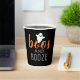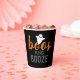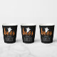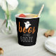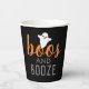 Moderne et mignon "Boos and Booze" Halloween coupes de fête en papier design caractéristiques texte en orange, gris charbon de bois, et lettrage blanc avec un petit accent fantôme.