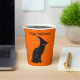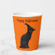 Un mignon chat noir s'assoit avec contentement en portant une étoile et une lune ornée de sorcières noires casquette. Les mots Happy Halloween peuvent facilement être changés en n'importe quel texte.