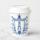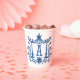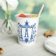 Ces tasses de monogramme de pagode chic sont parfaites pour divertir et faire un excellent cadeau d'hôtesse. Le design de la pagode et le monogramme sont en bleu marine sur blanc.