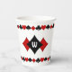 Poker Party Paper Cups avec un design original d'inspiration Art Déco utilisant les quatre symboles internationalement reconnus pour chaque combinaison de carte de jeu (coeurs, diamants, pique et clubs) dans Vermillion Rouge et Noir contre blanc croustillant, PLUS un champ de texte personnalisé pour votre monogramme. Économisez BIG en commandant en gros! Découvrez IconDoIt est la coordination des produits.