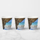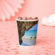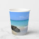 Tasses en papier avec une photo nature pittoresque. Belle mer bleu turquoise avec une plage de sable fin. Une grande roche brune offre de l'ombre du ciel bleu vif.