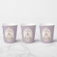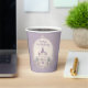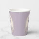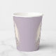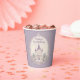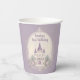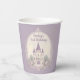 Une élégante tasse en papier de château de conte de fées violet pour fêter un anniversaire spécial de princesse.