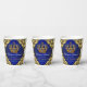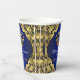 Coupes en papier baby shower Prince avec couronne bleu et or royal sur un bel arrière - plan bleu royal et tourbillon or.