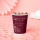 Ces élégantes tasses en papier de mariage sont ornées d'arrière - plans bordeaux, de lampes à cordes brillantes et d'oeuvres d'art florales dorées. Parfaits pour les mariages d’automne ou d’hiver, ces tasses sont customisées des noms et de la date du couple.