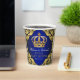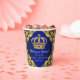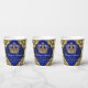 Coupes en papier baby shower Prince avec belle couronne bleu royal et or sur un arrière - plan bleu royal et tourbillon or.