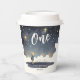 Cute Celestial Birthday Stars Watercolor Boy Paper Cups présente une jolie aquarelle d'un petit garçon regardant les étoiles. Idéal pour bébé garçon, les enfants fêtes de premier anniversaire et les baby showers. Conçu par Evco Studio. Pour la coordination des éléments, voir www.zazzle.com/store/evcostudio