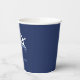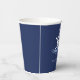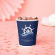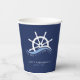 Gobelets en papier bleus et blancs pour enterrement de vie de jeune fille / fête de mariage avec gouvernail de bateau et la phrase "dernière voile avant le voile". Personnalisez-les avec les détails de votre événement.