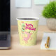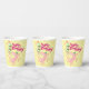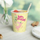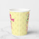 Un cochon heureux sur des tasses de papier d'anniversaire. Utilisez "Personnalisez ce modèle" pour modifier le texte "Joyeux anniversaire !" et créer un message unique et customisé ; les changements de texte sont reflétés de part et d'autre. Accessoires de fête avec un cochon brillant, sous un gâteau de couche de teetering avec des éclats de glace verte et surmonté de bougies roses.