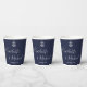 Dotés d'une ancre et d'un nom signature, ces élégantes tasses en papier bleu marine peuvent être personnalisées avec vos détails de mariage nautique en lettres blanches chic. Conçu par Thisisnotme©