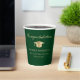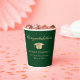 Élégantes tasses de papier vertes de la fête de graduation avec un casquette d'or, "Félicitations" dans un scénario classique et le nom du diplômé, l'école et l'année de classe dans la typographie moderne.