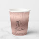 Des tasses en papier chic pour sa fête de 70e anniversaire avec "70 & Fabulous" dans un script de calligraphie sur un arrière - plan rose en or avec des gouttes en parties scintillant rose en or.