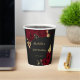 Élégantes fleurs bordeaux avec quelques feuilles dorées romantiques sur fond noir pour tasse en papier de fête