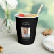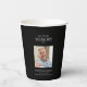 Des tasses en papier noir personnalisées commémorant les funérailles avec une grande photo de votre être cher perdu, le texte en mémoire d'amour de, leur nom, date de naissance/décès, et le souvenir disant que nous vous porterons toujours dans nos coeurs. idéal pour les boissons et collations après le service. si vous avez des problèmes avec ce design, veuillez me contacter tjanine par mon magasin zazzle, le studio de printemps willow et sera heureux de vous aider