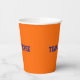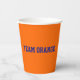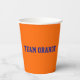 Tasses en papier avec base orange et bleu foncé design de texte personnalisé "Team Orange". Il est maintenant simple de personnaliser avec votre propre nom d'équipe, le logo de la ville, etc. Conception par Alma Wad.