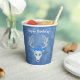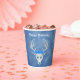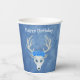 Ces gobelets en papier sont un mélange de nuances de bleu avec une tête de cerf blanc fantaisiste qui a trois roses bleues et des bois sur la tête. Personnalisez le texte Joyeux Anniversaire avec les modèles sur l'avant et l'arrière.