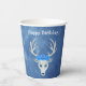 Ces gobelets en papier sont un mélange de nuances de bleu avec une tête de cerf blanc fantaisiste qui a trois roses bleues et des bois sur la tête. Personnalisez le texte Joyeux Anniversaire avec les modèles sur l'avant et l'arrière.
