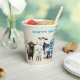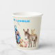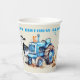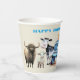 Coupes de papier pour la fête d'anniversaire du garçon. Design à thème de ferme avec animaux de basse-cour et image de tracteur bleu qui enroule autour des tasses qui viennent en deux tailles. Inclure le texte de votre choix, en lettres bleues croustillantes, en haut. Des tasses peuvent également être achetées avec des couvercles.