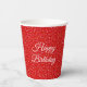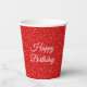 Confetti festif d'anniversaire sur tasses en papier parties scintillant rouge. Le texte peut être personnalisé.