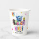 Des tasses de papier Monster Anniversaire amusantes et colorées. Notre Petit Monstre tourne (ajoutez l'âge) ! Design propose un groupe de mignons monstres colorés amusants d'aquarelle, des confettis d'étoiles, un texte en arc-en-ciel audacieux et un modèle de fête d'anniversaire moderne qui est facile à customiser.