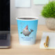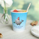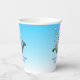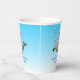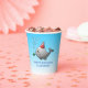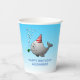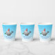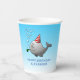 Des tasses en papier d'anniversaire avec une jolie illustration d'une petite baleine. La baleine porte un casquette rayé rouge et blanc et a commencé la fête d'anniversaire dans la piscine.