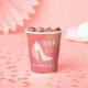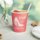 Tasse en papier pour enterrement de vie de jeune fille avec talon haut blanc élégant "Future mariée" sur fond rose pêche.