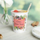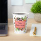 Jolis gobelets en papier pour fête de mariage ou mariage réalisés en blanc, avec des fleurs sauvages colorées. Une zone de texte corail et or, des deux côtés, comporte un texte personnalisé en noir. Personnalisez le texte selon vos besoins pour l'événement.
