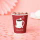 Coupes de papier de Noël pour une fête de chocolat chaud. Ces tasses sont équipées d'une tasse souriante de cacao chaud avec un sucre de canne et de plusieurs guimauves joyeuses sur un arrière - plan rouge. Tous les mots peuvent être customisés. Fête de Noël Chocolat chaud cacao chaud tasses de papier Sweetsham nourriture Art | ©Melissa Patton - Artiste/Illustrateur