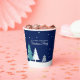 Beau ciel bleu minuit avec sapins de Noël décorent cette jolie tasse de papier de fête de Noël personnalisée pour un dîner en famille. La neige longe la belle forêt et des flocons de neige blancs parsement dans l'air de nuit. Personnalisez ce joli décor pour un rendez-vous de vacances.