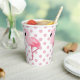 Des tasses en papier de style rétro, avec des graphiques de flamants roses à l'allure moelleuse sur un arrière - plan de pois rose et blanc. Des serviettes et des assiettes en papier assorties sont disponibles.