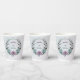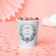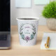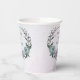 Tasse en papier unique avec des fleurs romantiques poussiéreuses violettes et bleues et des feuilles vertes.