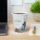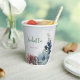 Magnifique tasse en papier botanique présentant des fleurs roses, bleues poussiéreuses et bleues nuit avec des feuilles vertes.