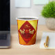 Coupe double en papier de Cheval doré avec lanterne chinoise et idéogramme de Fu doré (signifiant chance), fleurs et salut chinois en petits cercles sous les Chevaux + "Année du Cheval" + doré 2026 (écriture manuscrite originale) sur un papier texturé doré (image imprimée). Conception sur tasse de papier de fête. Carte de voeux, carte postale de vacances, serviette en papier, plaque en papier (et plus bientôt)... Parfait pour le Nouvel An Chinois du Cheval 2026.