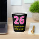 Ce motif joyeux d'autocollant carré à thème d'anniversaire comporte un grand numéro "26" avec un motif rose foncé et rose clair rayures, avec le message "Joyeux 26e anniversaire", et un nom modifiable. L'arrière - plan est noir de couleur. Des tasses en papier comme celle-ci pourraient être utilisées à une fête pour quelqu'un qui célèbre son 26e anniversaire. [~Z0000580]