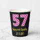 Ce joyeux autocollant carré sur le thème de l'anniversaire comporte un grand numéro "57" avec un motif rose foncé et rose clair rayures, avec le message "Happy 57th Birthday,", plus un nom personnalisable. L'arrière - plan est noir de couleur. Des tasses de papier sur le thème de l’anniversaire comme celle-ci pourraient être une façon amusante de célébrer le cinquante-septième anniversaire de quelqu’un. [~Z0000580]