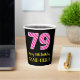 Ce motif joyeux d'autocollant carré à thème d'anniversaire comporte un grand numéro "79" avec un motif rose clair et rose foncé rayures, avec le message "Happy 79th Birthday,", et un nom personnalisable. L'arrière - plan est noir de couleur. De jolies tasses en papier comme celle-ci peuvent être amusantes à utiliser lors d’une fête en l’honneur du soixante-dix-neuvième anniversaire de quelqu’un. [~Z0000580]